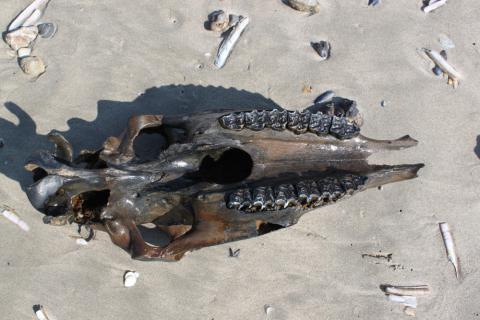 Deze schedel van een paard werd aangetroffen op het strand. De ouderdom kan variëren tussen 1200 en 1950.