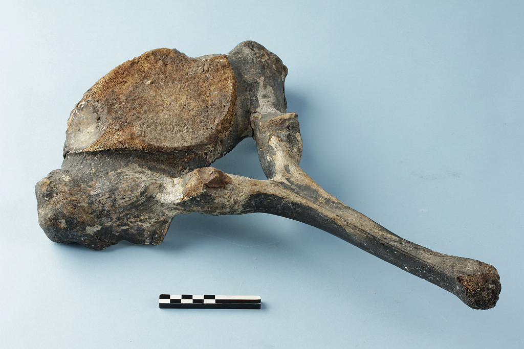 Borstbeenwervel van woudolifant of wolharige mammoet, opgebaggerd uit havengeul van Zeebrugge, voor 1992