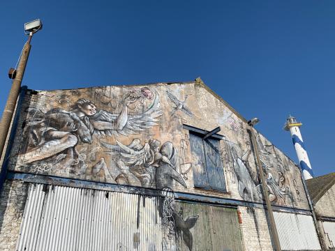 Zeewetenschap en kunst dichter bij elkaar brengen, dat is wat graffitikunstenaar Jamz Jamezon en VLIZ voor ogen hadden met de graffitimuur op de site van het Marien Station Oostende. Het werk zonder naam belicht het leven in de oceaan op een romantische manier en straalt hoop uit in een tijd waar de oceaan het hard te verduren krijgt. Wie het kunstwerk met eigen ogen wil aanschouwen moet snel zijn, want binnenkort maken de oude loodsen plaats voor het ‘Ocean Innovation Space’, de uitbreiding van het mariene station van het VLIZ.