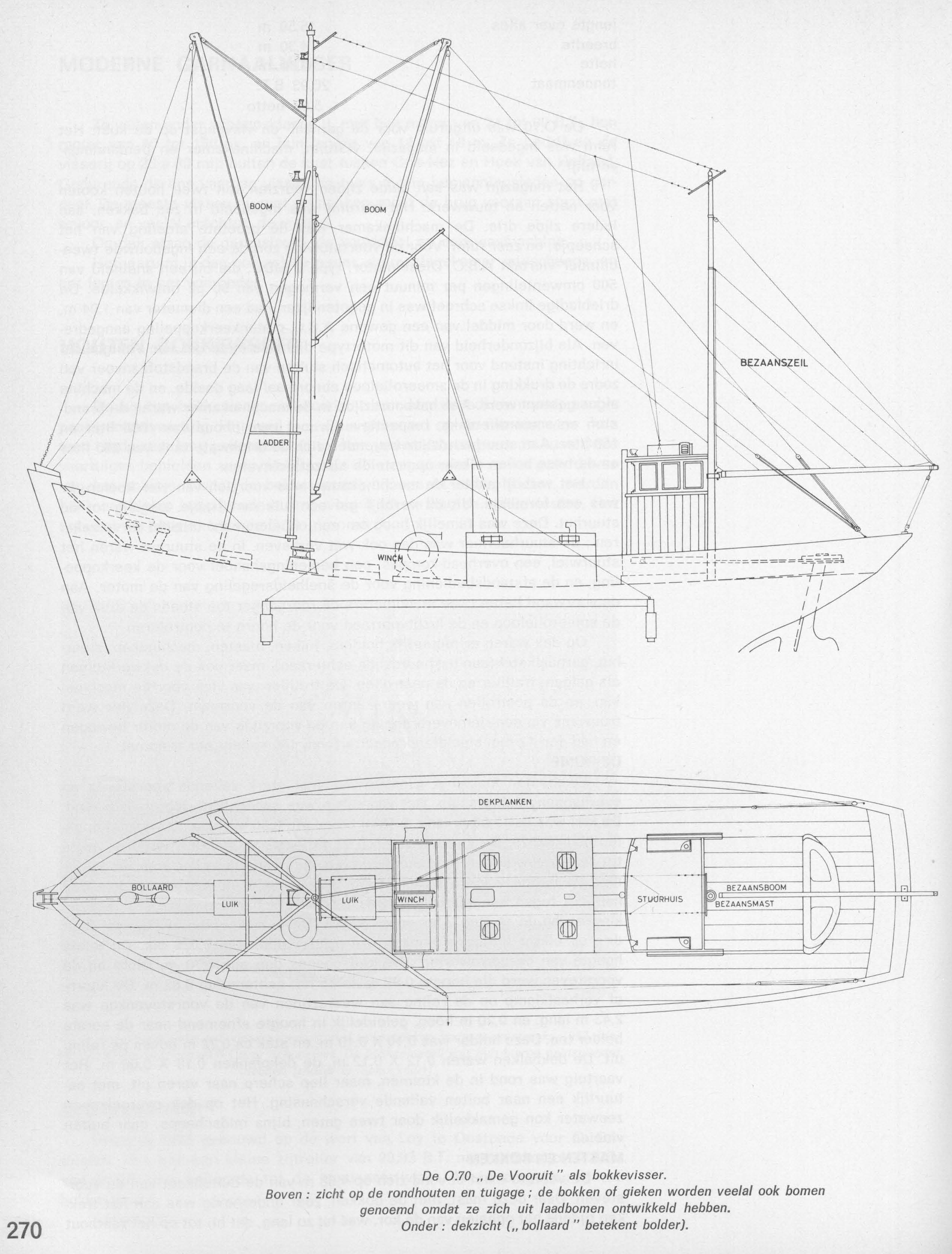 Boven: zicht op de rondhouten en tuig ; de bokken of gieken (rondhout waaraan de netten, zeilen of last buiten boord hangen en mee kunnen verplaatst worden) worden veelal ook bomen (rondhouten tot het openhouden van het zeil, net, e.d.) genoemd omdat ze zich uit de laadbomen (dienden voor het laden en lossen) ontwikkeld hebben.