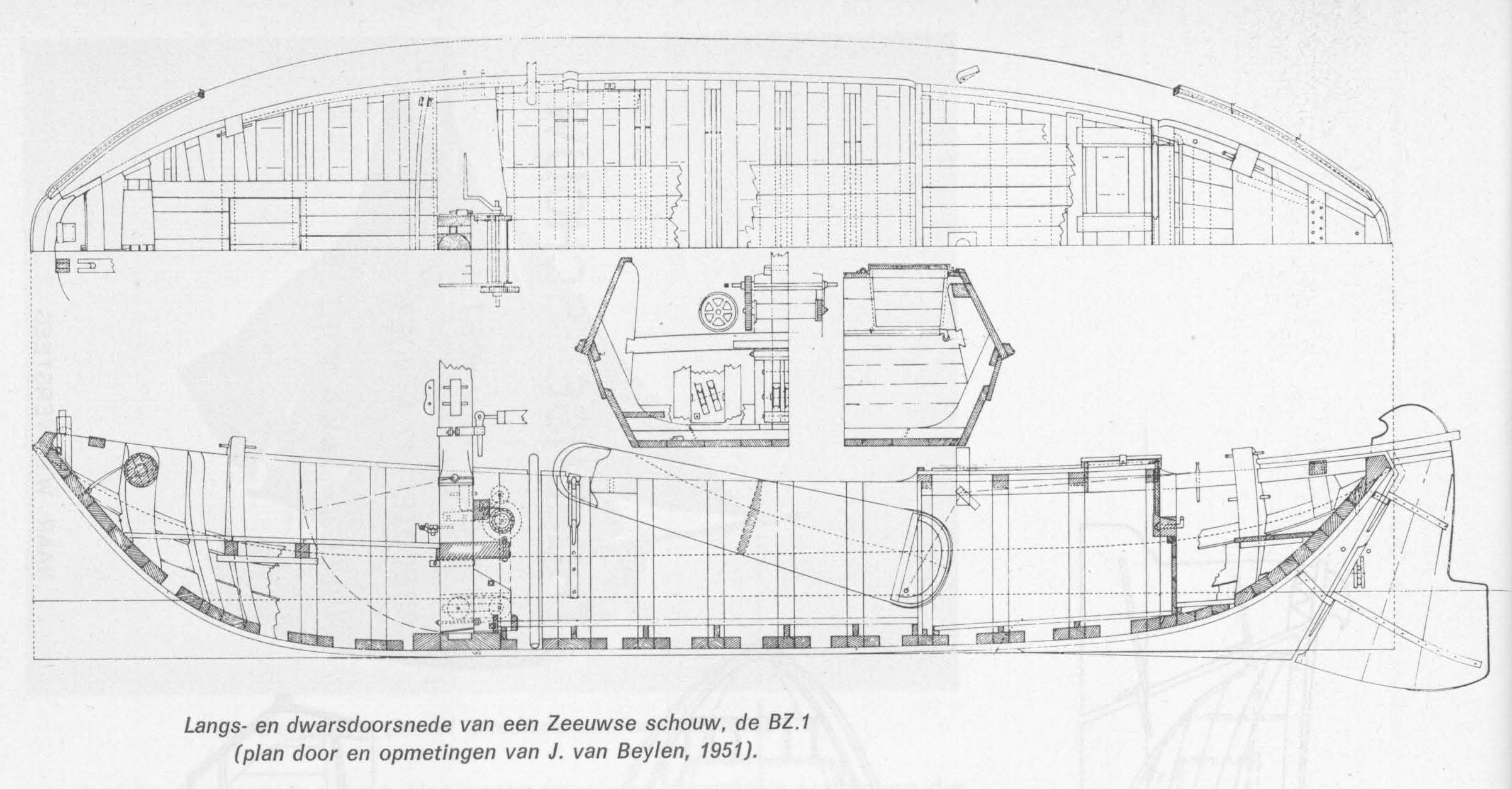 Langs- en dwarsdoorsnede van een Zeeuwse schouw, de BZ.1 (plan door en opmetingen van J. van Beylen, 1951).