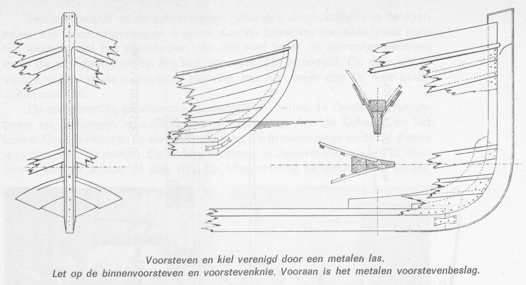 Voorsteven en kiel verenigd door een metalen las. Let op de binnenvoorsteven en voorstevenknie. Vooraan is het metalen voorstevenbeslag.