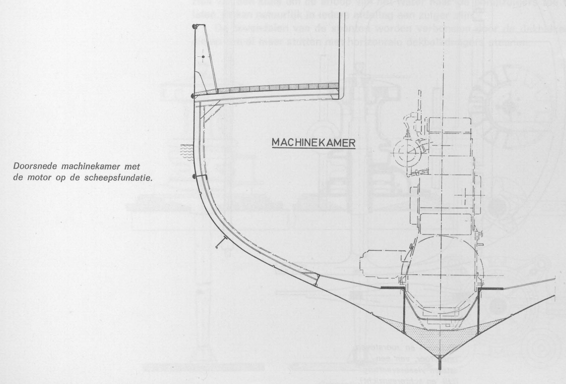 Doorsnede machinekamer met de motor op de scheepsfundatie.
