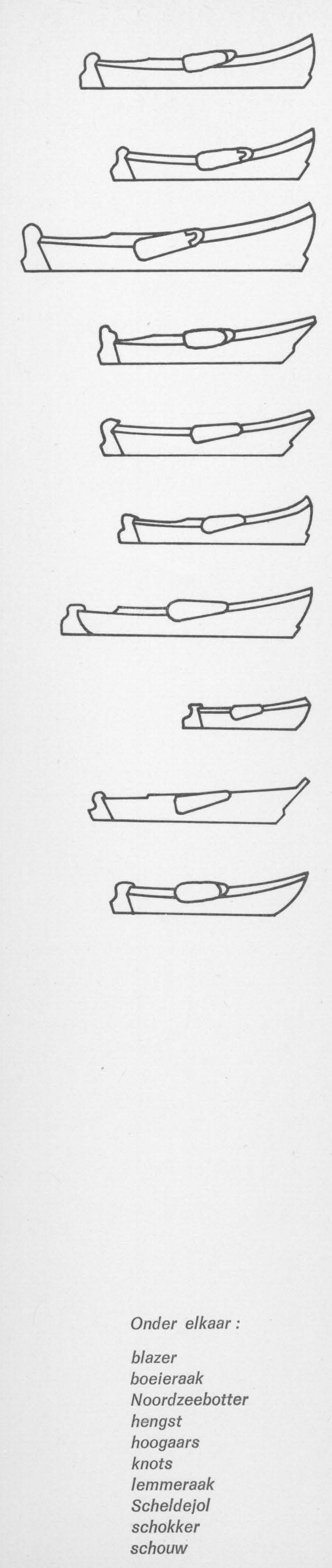Beschrijving Van boven naar onder: blazer, boeieraak, Noordzeebotter, hengst, hoogaars, knots, lemmeraak, scheldejol, schokker en schouw.