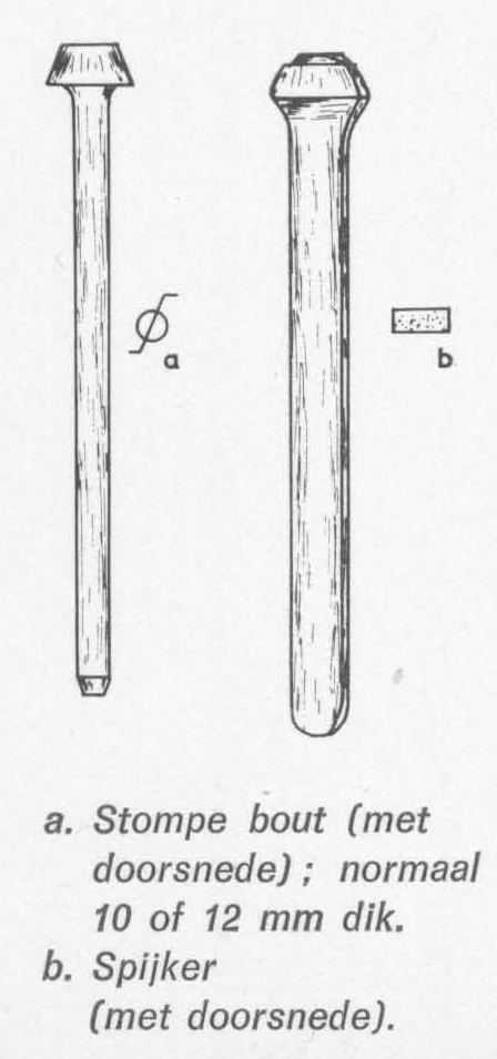 a. Stompe bout (met doorsnede) ; normaal 10 of 12 mm dik. b. Spijker (met doorsnede).