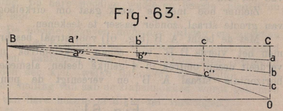 Beschrijving Dekbalken. Men weet dat de bocht der dekbalken van één dek met eene zelfde cirkelstraal moet bepaald worden. Men kan ook het grondbegin der parabool toepassen: men verdeelt in vier gelijke deelen de hoogte O C en de halve rechte lijn B C. Men verbindt B met de verdeelingen a, b, c, van O C, men trekt op de verdeelingen a’ b’ c’ van B C rechtstandige lijnen. Hunne snijpunten a”, b”, c”, met de eerste lijnen geven de punten waardoor de cirkelboog B a” b” c” O zal getrokken worden. Auteur J. De Borger Uit bron De Borger, J. (1901). Uitslaan van ijzeren of stalen sche... (pagina 88) Download de volledige versieDownload de volledige versie