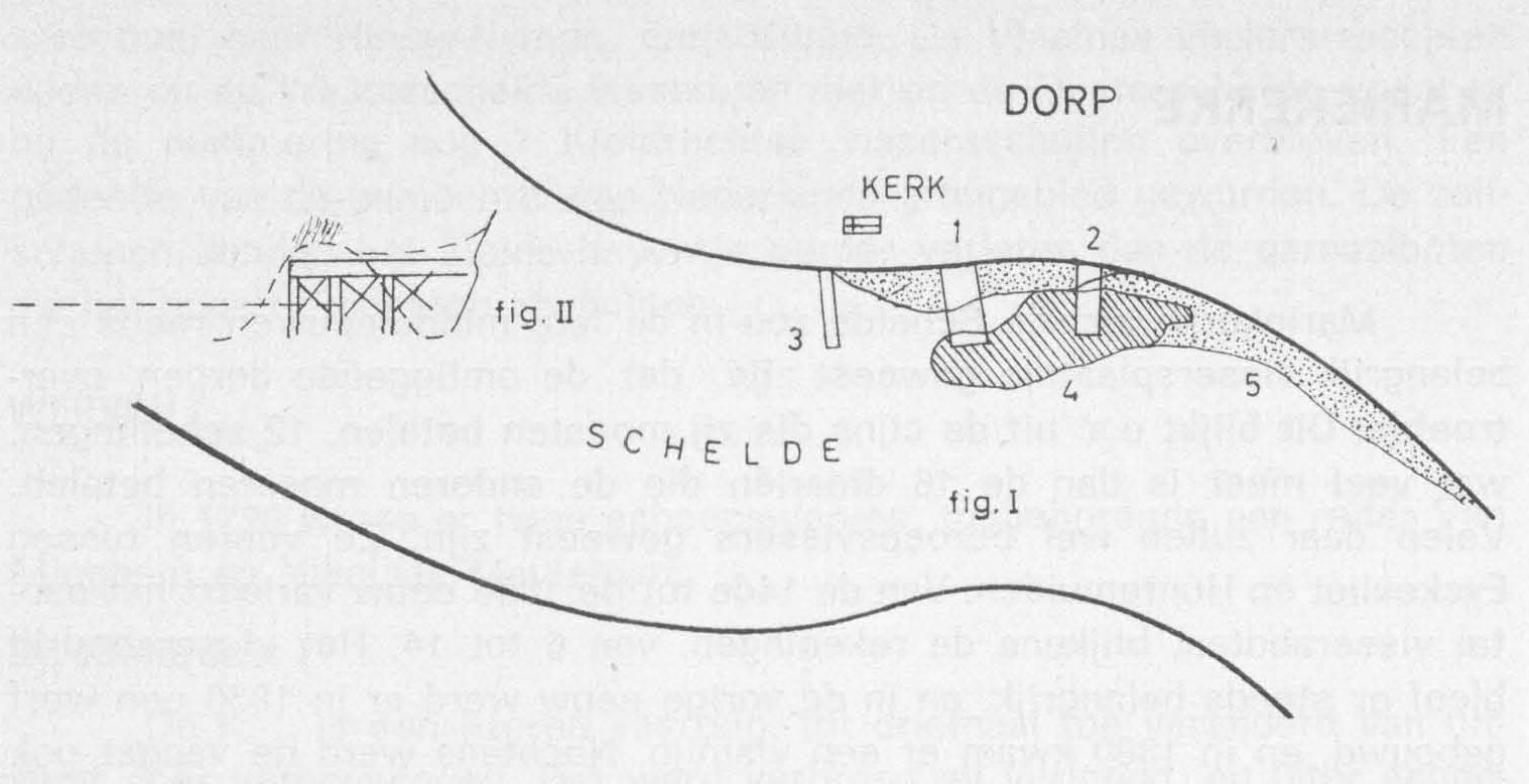 Fig. I 1 en 2 zijn aanlegstijgers waarvan er van 1 nog een weinig te zien is ; 4 toont aan hoe die steigers langzaam maar zeker ingesloten warden, en date r een duin met duingras gevormd werd ; 5 laat zien hoe de aanslibbing verder gaat ; 3 is de hedendaagse (1974) aanlegsteiger van de veerboot.