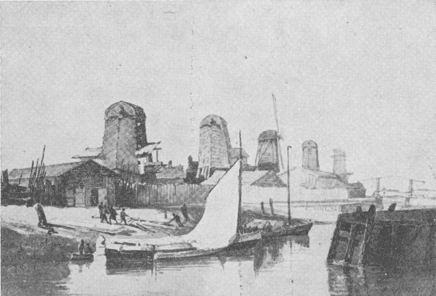 De zaagmolens van Molendorp te Oostende van houtzagerijen die de scheepswerven voorzien in 1821. Rechts de brug van Sas van Slijkens.