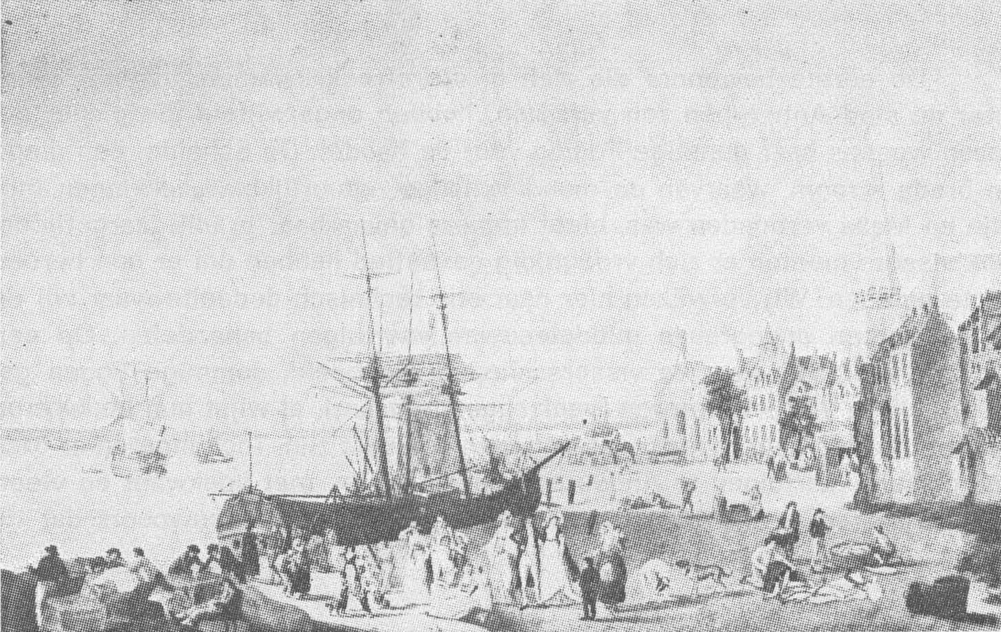 Schilderij van een zicht op de werf te Antwerpen (ca. 1800). Let op de visverkoop.