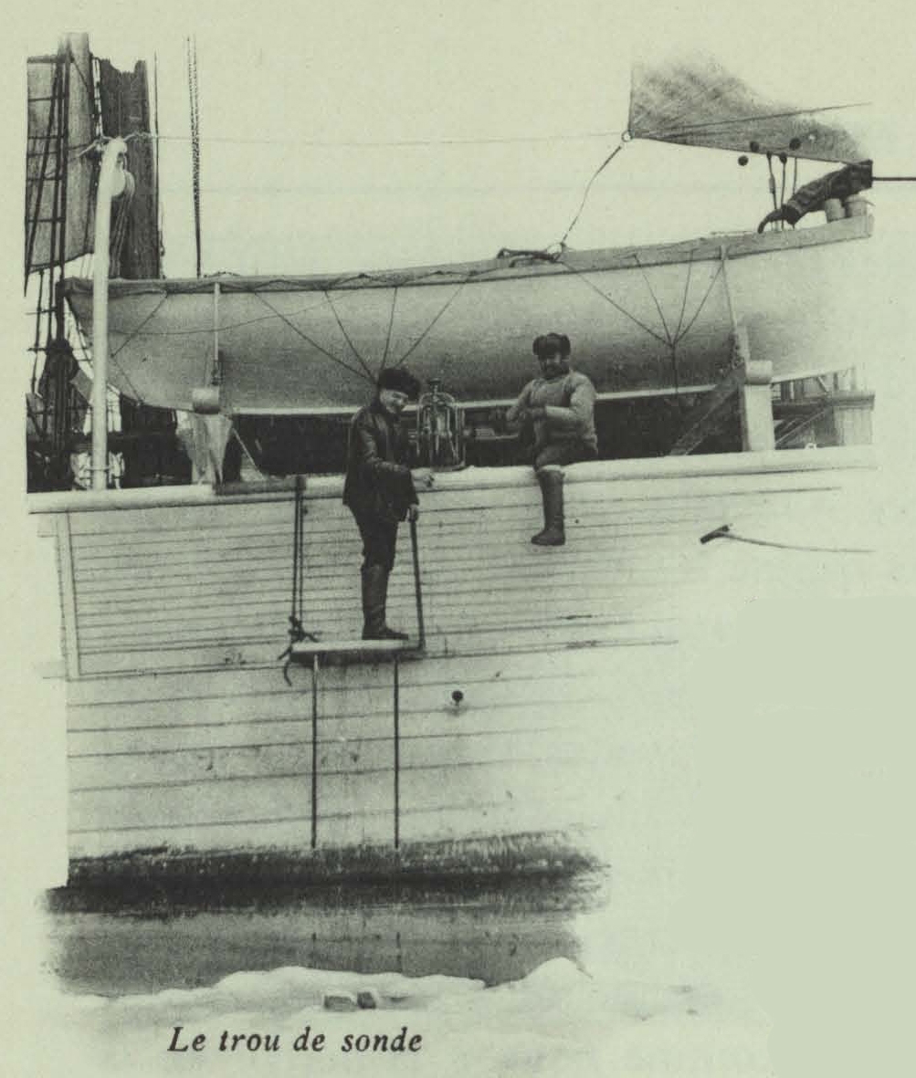 Vastgevroren in het pakijs in de Kara Zee, 12 augustus. Het boorgat in het ijs waardoor men het peillood liet zakken om dieptemetingen uit te voeren.