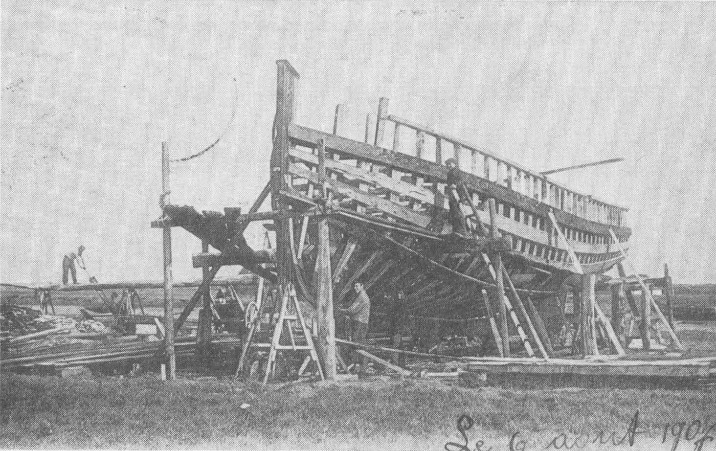 Bouw van de Nieuwpoortse dandy-cutter omstreeks 1900 (werf Denye ?).