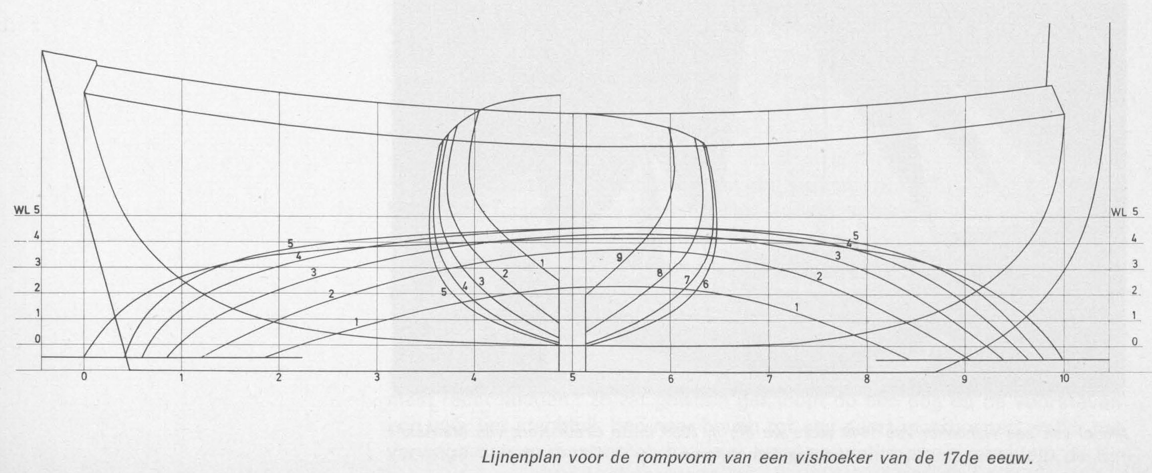 Lijnenplan voor de rompvorm van een vishoeker van de 17de eeuw.