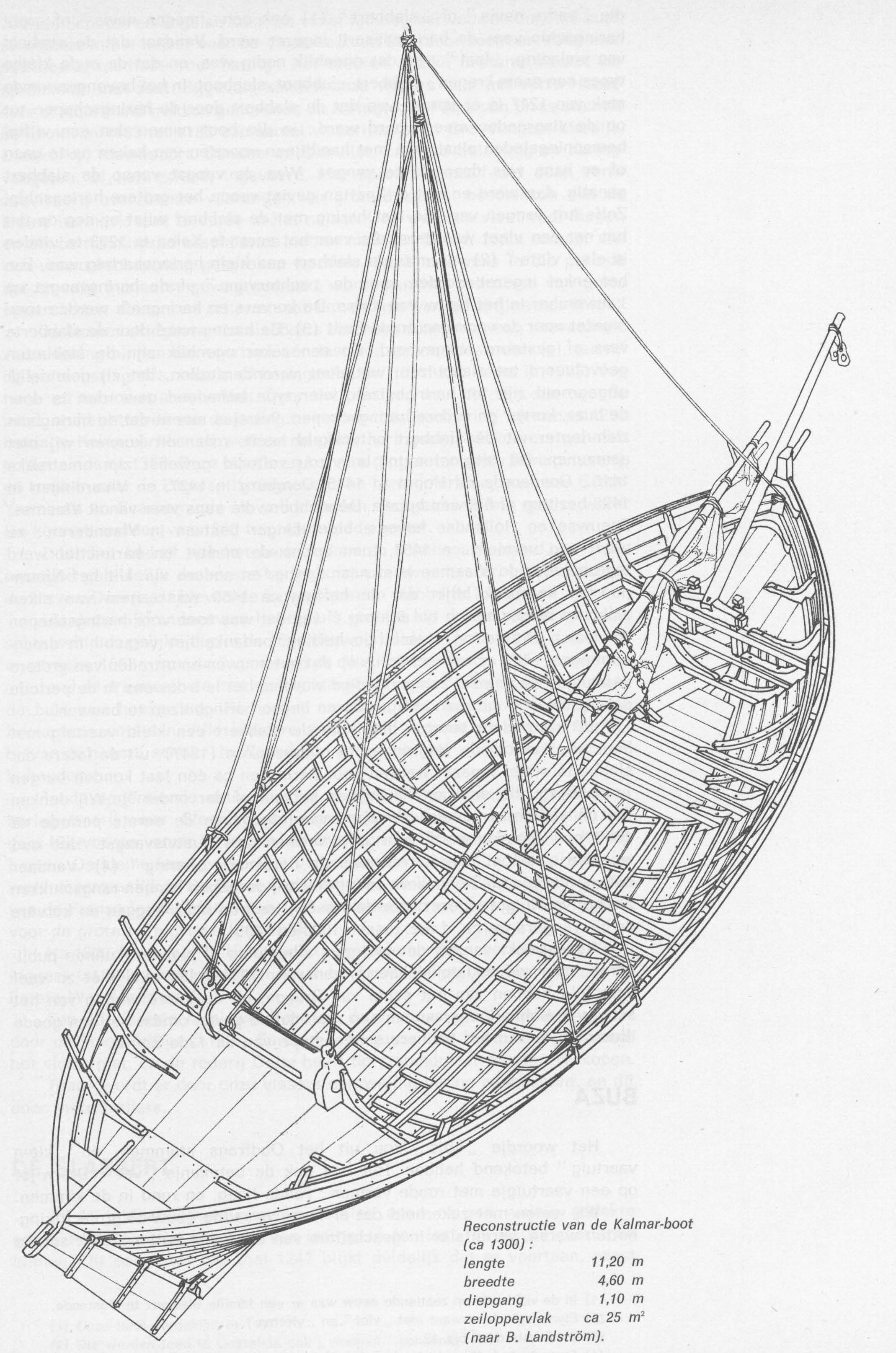Reconstructie van de Kalmar-boot (ca. 1300) : Lengte 11.20 m Breedte 4.60 m Diepgang 1.10 m Zeiloppervlak ca. 25 m²