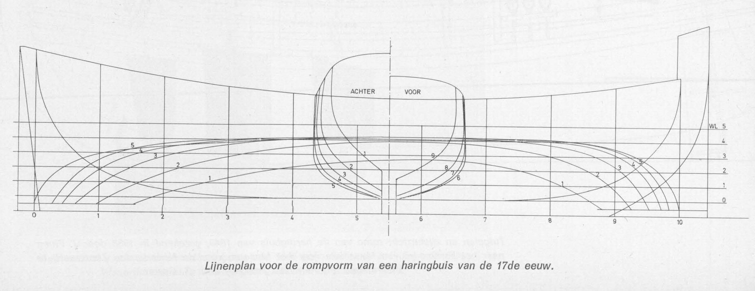 Lijnenplan voor de romp van een haringbuis van de 17de eeuw.