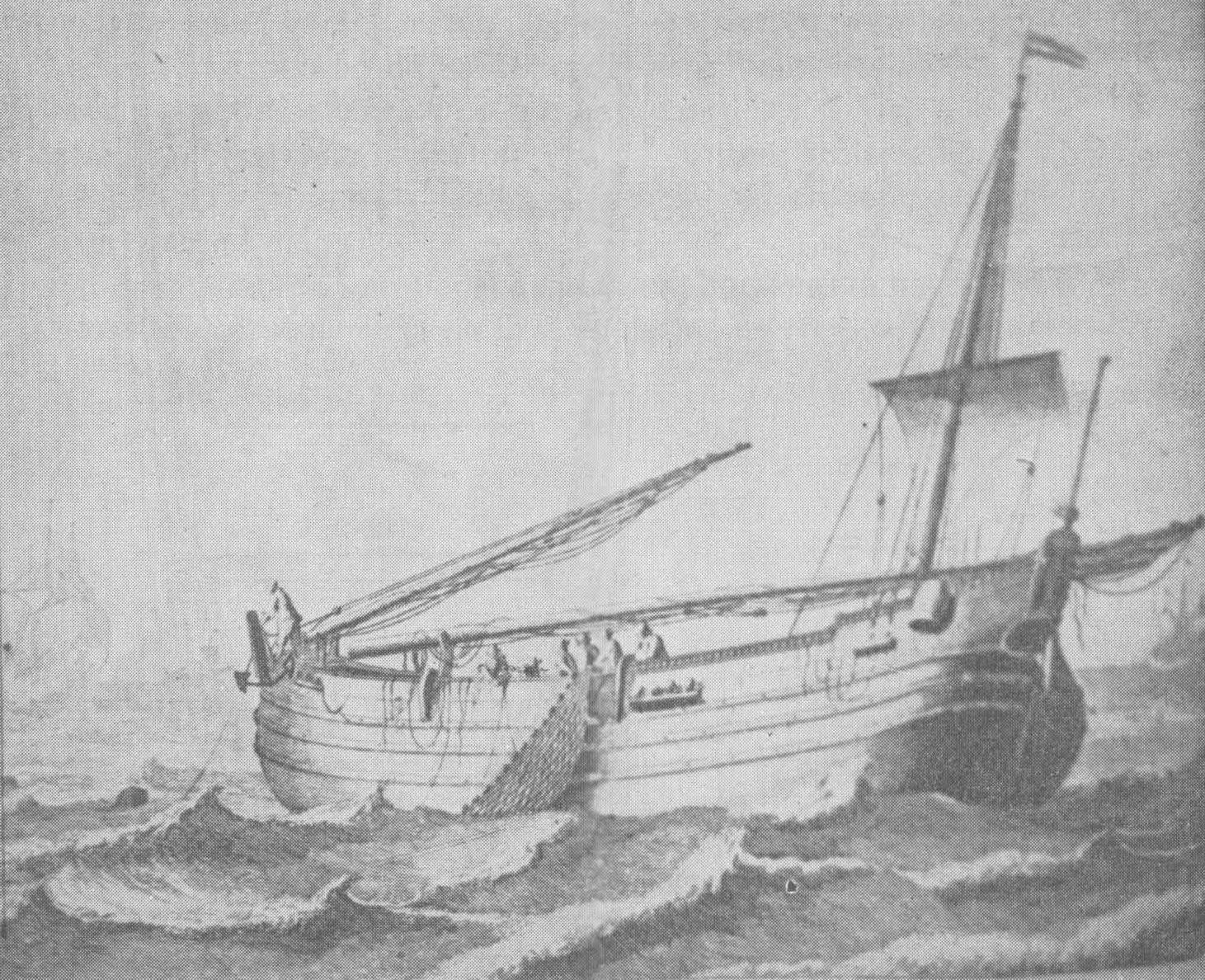 Haringbuis van de tweede helft van de 17de eeuw. De vleet of het net wordt over de rol tussen de geesten van het nettenpoort getrokken. De invloed van de fluit, een Nederlands koopvaardijschip van de 17de en 18de eeuw, is duidelijk te merken aan het smalle achterschip.