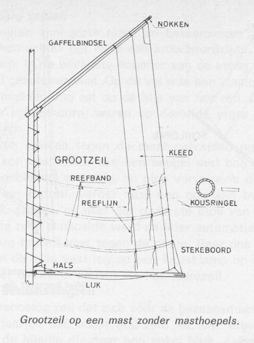 Grootzeil (onderzeil aan de grote mast) op een mast zonder masthoepels (hoepel aan het mastlijk (zeilzoom) rondom de mast tot geleiding).