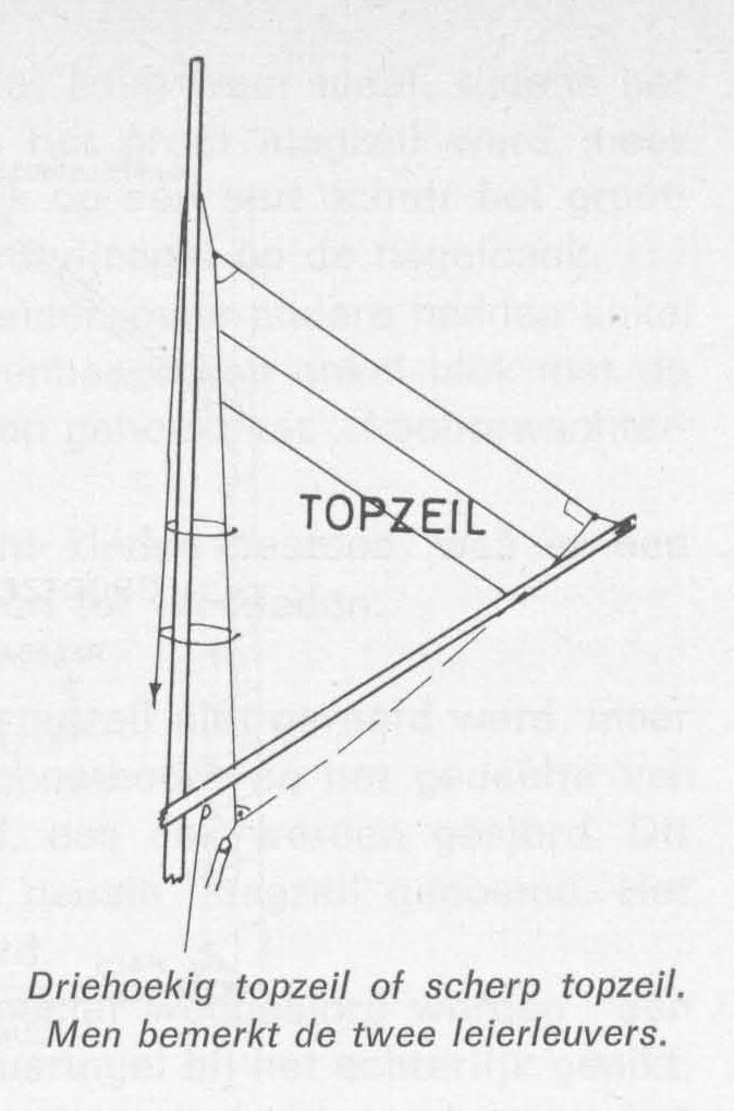 Driehoekig topzeil of scherp topzeil. Men bemerkt de twee leierleuvers (oog van touwwerk om het zeilzoom om iets aan het zeil te bevestigen).