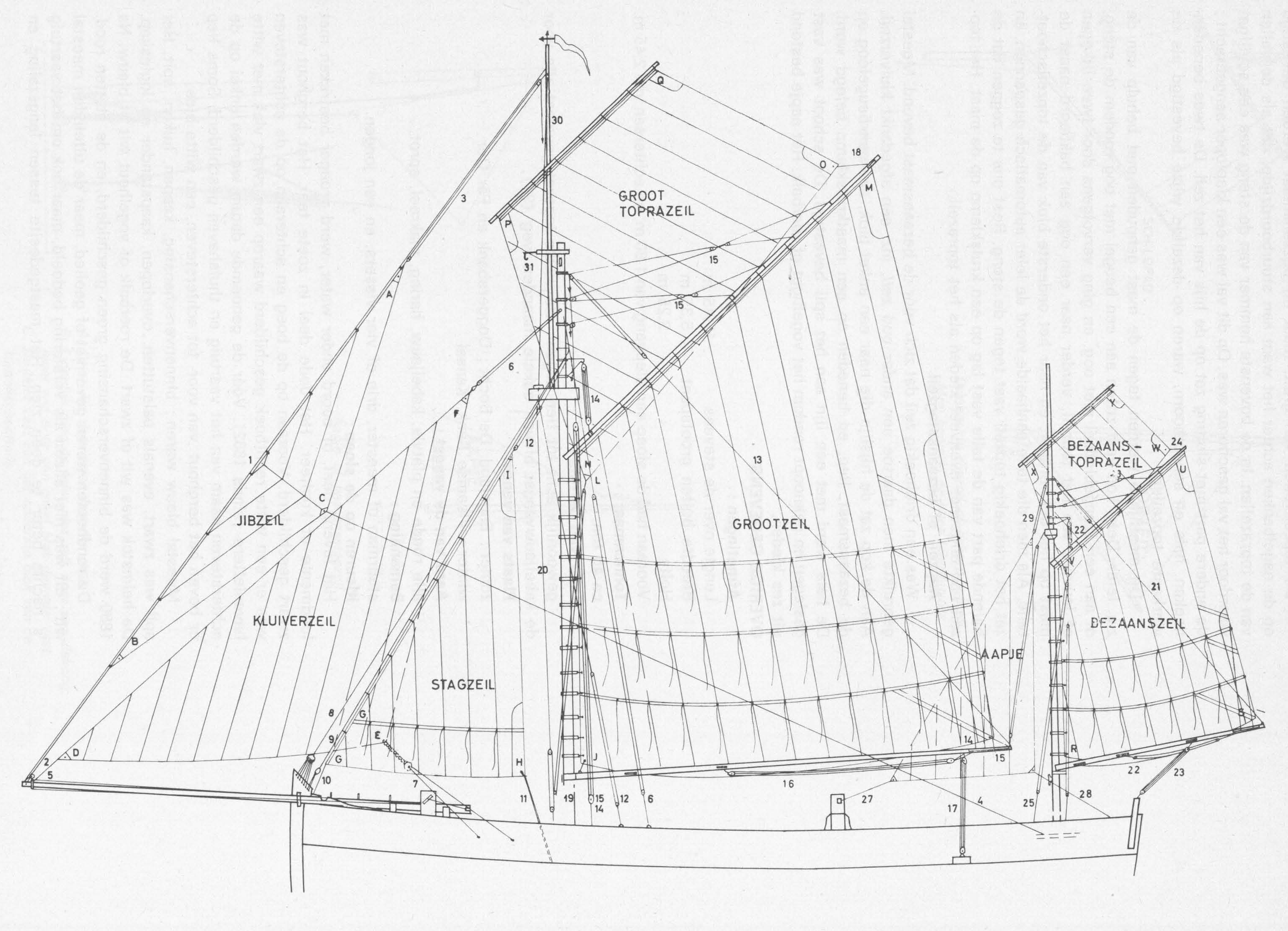 27. Hals van het aapje (driehoekig zeil dat zich voor de bezaansmast bevond).