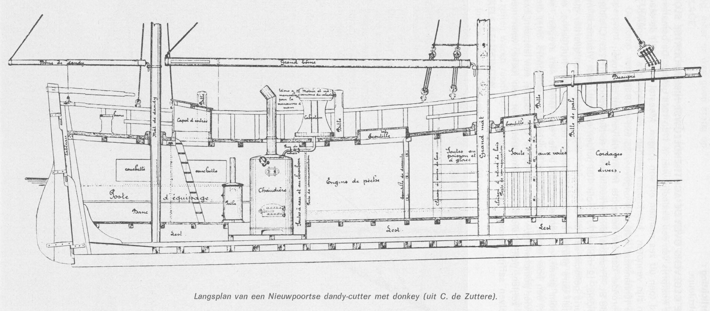 Langsplan van een Nieuwpoortse dandy-cutter met donkey (kleine stoommachine).