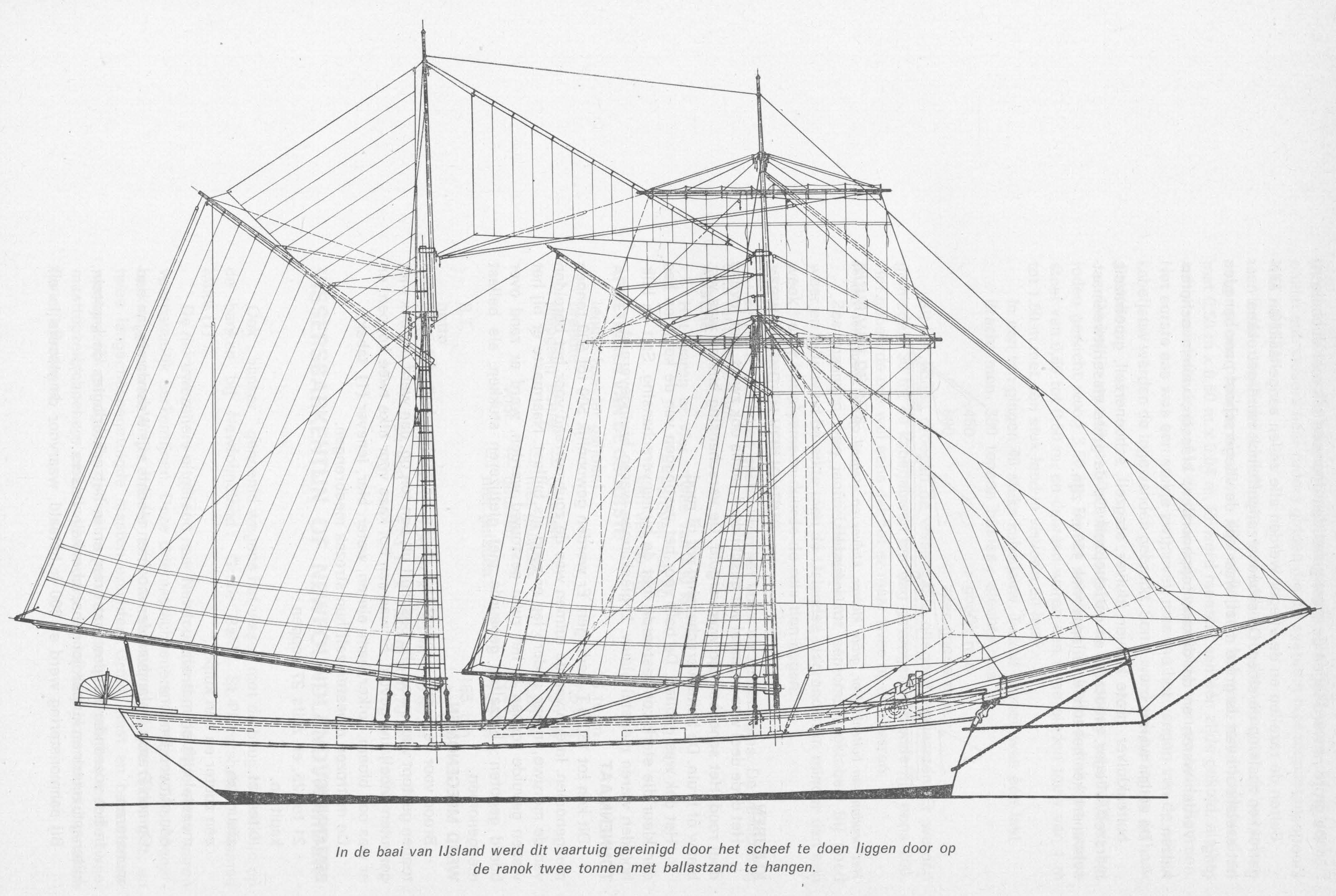 (Zeil)tuig van de IJslandvaarder. In de baai van IJsland werd dit vaartuig gereinigd door het scheef te doen liggen door op de ranok (uiteinde van de ra (rondhouten tot het houden van een razeil)) twee tonnen met ballastzand te hangen.