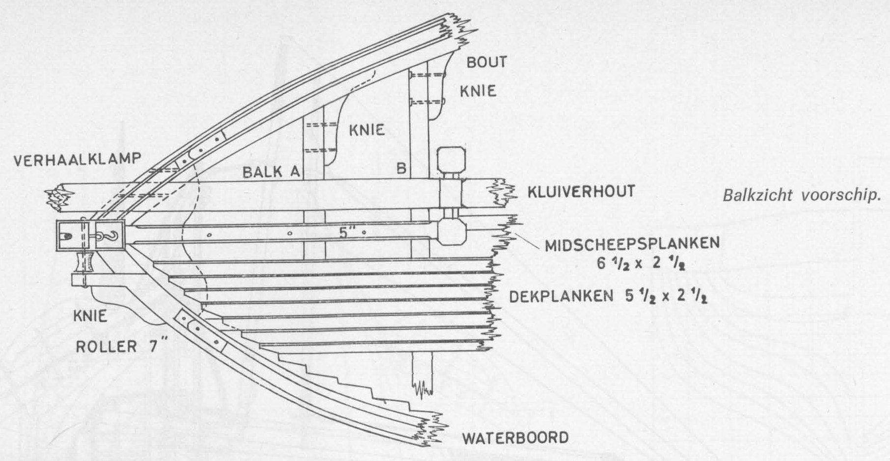 Lowestoft-smack: Balkzicht voorschip.