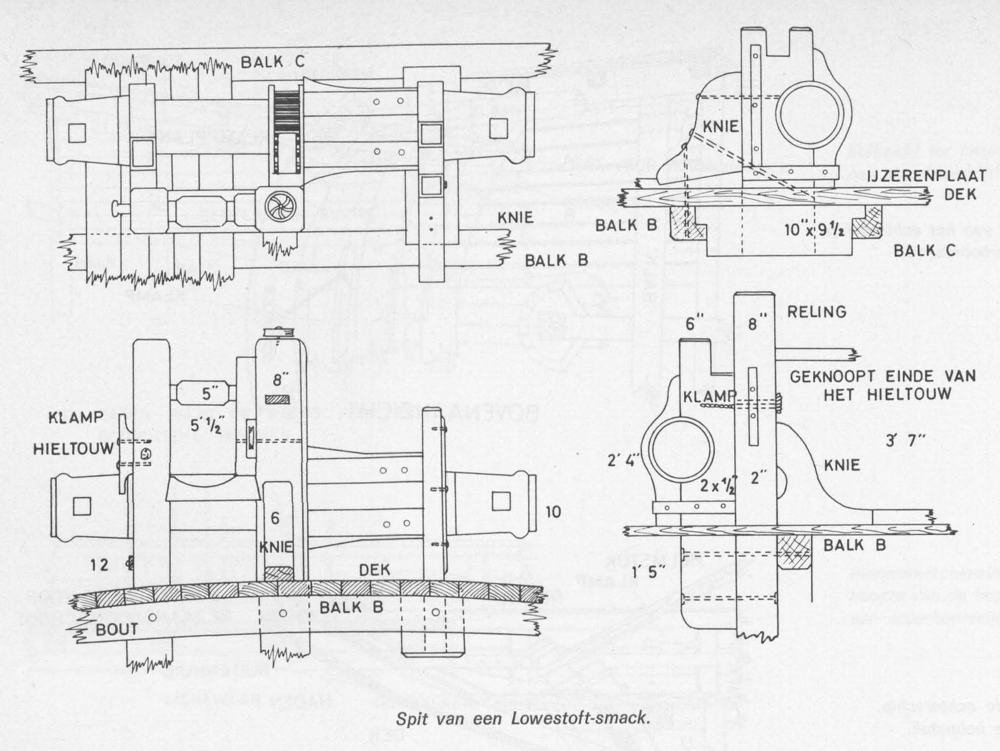 Beschrijving Spit, dit is een eenvoudige windas waarmee anker of ra (rondhout voor het houden van een zeil) kon worden opgetrokken, van een Lowestoft-smack.