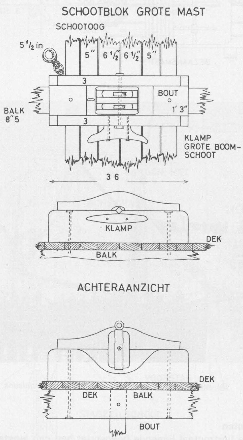Schootblok (blok van een lijn aan de benedenhoek van een topzeil, dit is een zeil gevoerd boven een kluiver, gaffelzeil of bezaan) van de grote mast.