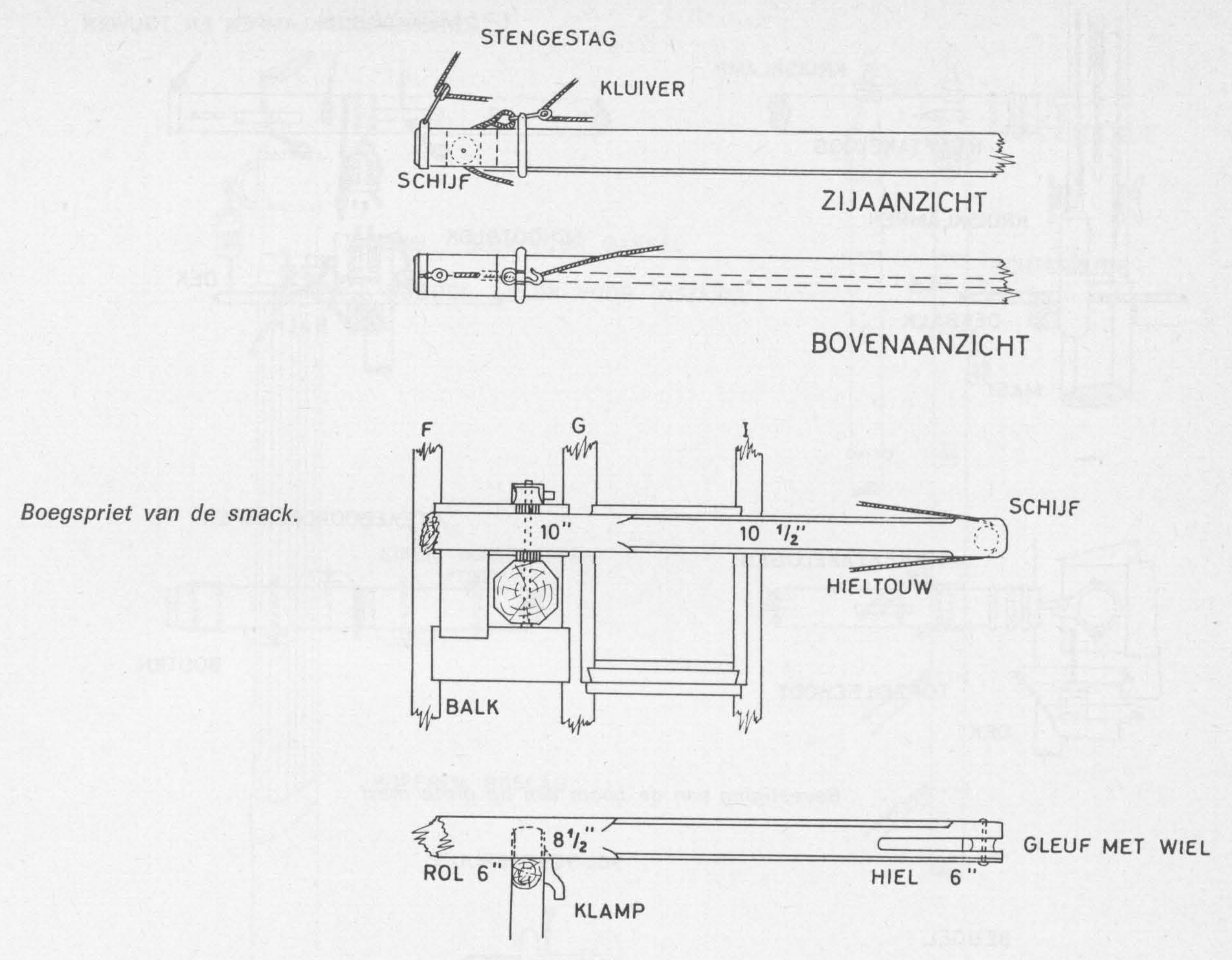 Boegspriet (rondhout voor de voorsteven) van de smack (snelle en lichte zeiler van Engelse oorsprong).