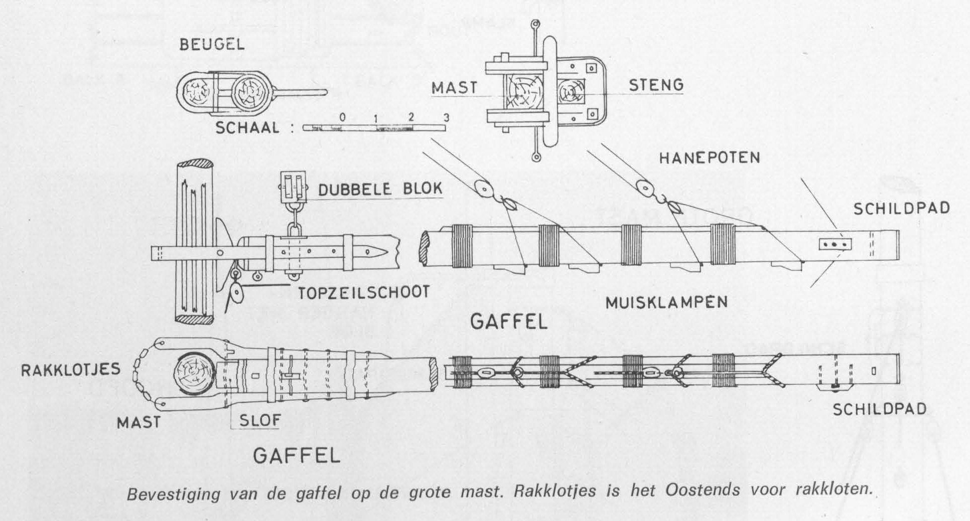Bevestiging van de gaffel (rondhout voor het ophouden van bovenste zeilzoom van een vierhoekig langsscheeps zeil) op de grote mast bij een smack (snelle en lichte zeiler van Engelse oorsprong). Rakklotjes is het Oostends voor rakkloten.