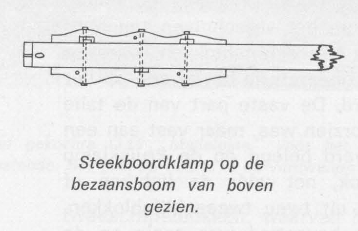 Steekboordklamp op de bezaansboom (rondhout tot het openhouden van het zeil) van boven gezien bij de smack (snelle en lichte zeiler van Engelse oorsprong).
