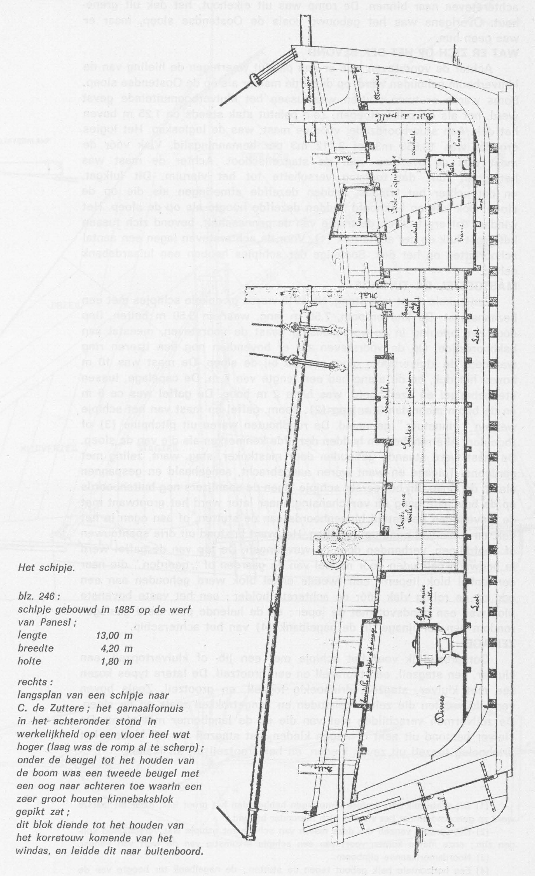 Beschrijving Het langsplan van een schipje. Het garnaalfornuis in het achteronder stond in werkelijkgeid op een vloer heel wat hoger, laag was de romp al te scherp. Onder de beugel (ring aan boord waardoor een rondhout loopt) tot het houden van de boom (rondhout tot het openhouden van het zeil, e.d.) was een tweede beugel met een oog naar achteren toe waarin een zeer groot houten kinnebaksblok (blok dat aan één zijde kan geopend worden om er eenlijn in te leggen zodat die niet vanaf het eind moet ingeschoren worden) gepikt zat. Dit blok diende tot het houden van het korretouw (touw in verbinding met het kornet of trechtervormig sleepnet) komende van het windas en leidde dit naar buitenboord.