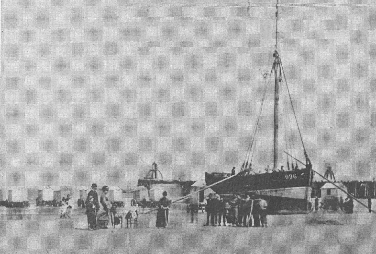 Het schipje O.96 van E. Deckmyn op het Klein Strand te Oostende. Duidelijk is de “moustache” (driehoekige boegversiering, meestal wit geverfd) onder het berghout (verzwaring van de huidbeplanking als bescherming).