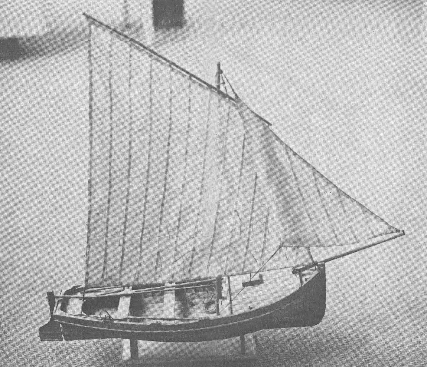 Schover (Oostends zeilvaartuig tussen 1860 en 1930) met roer en boegspriet (rondhout voor de voorsteven) (model G. Desnerck).