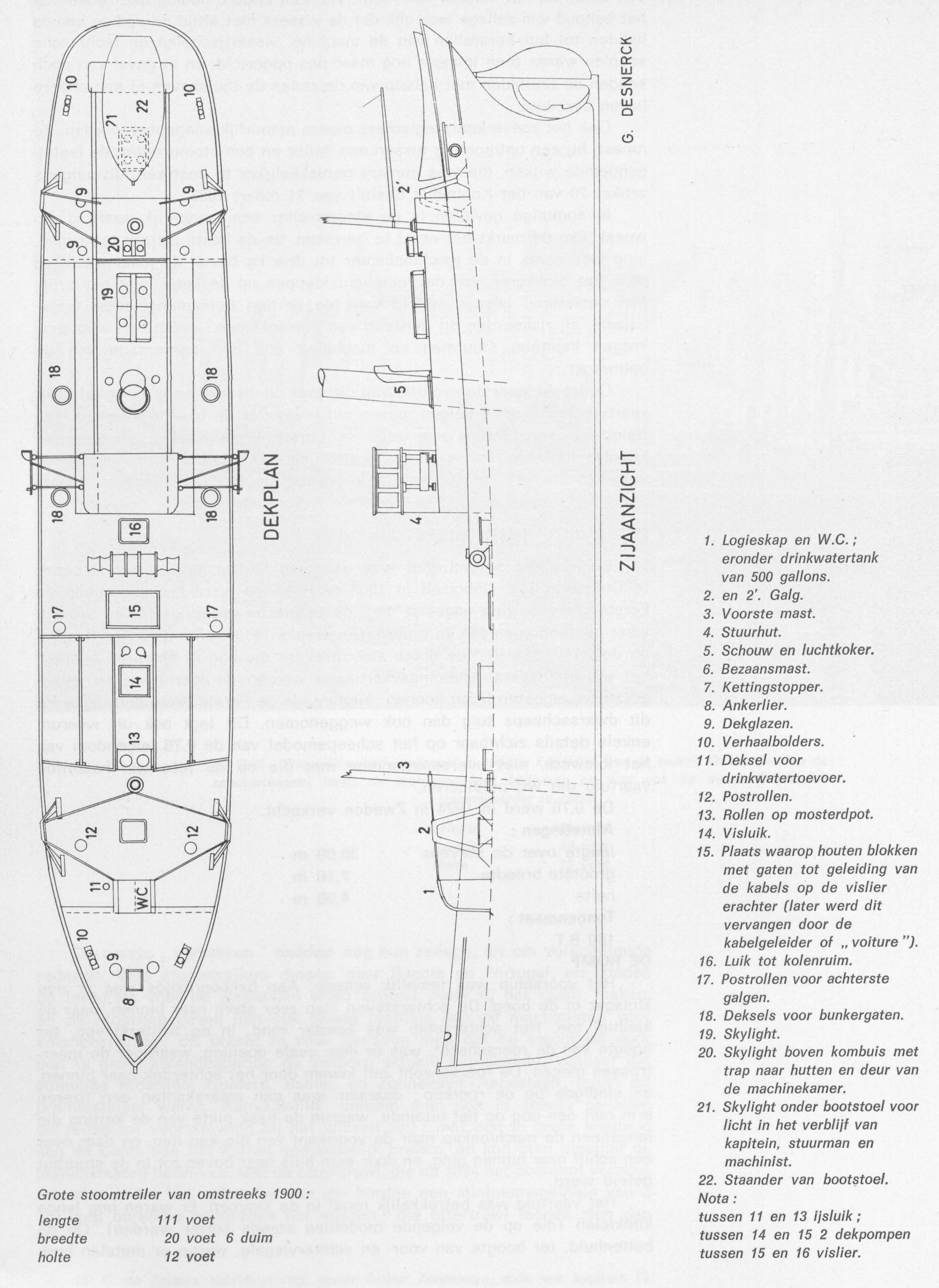 Beschrijving Dekplan en zijaanzicht van grote stoomtreiler van omstreeks 1900 (G. Desnerck):