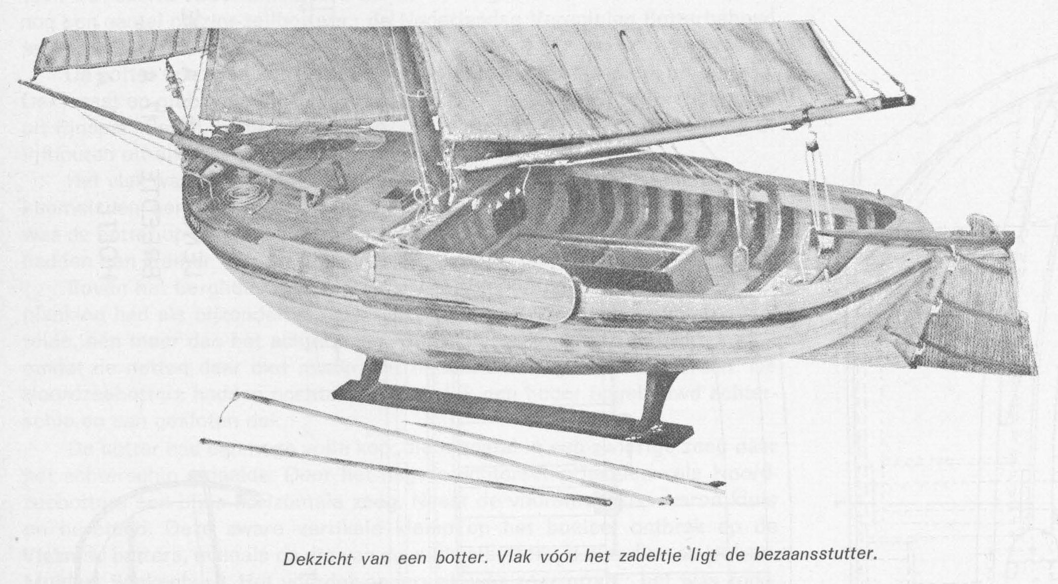 Dekzicht van een botter. Vlak vóór het zadeltje ligt de bezaansstutter.