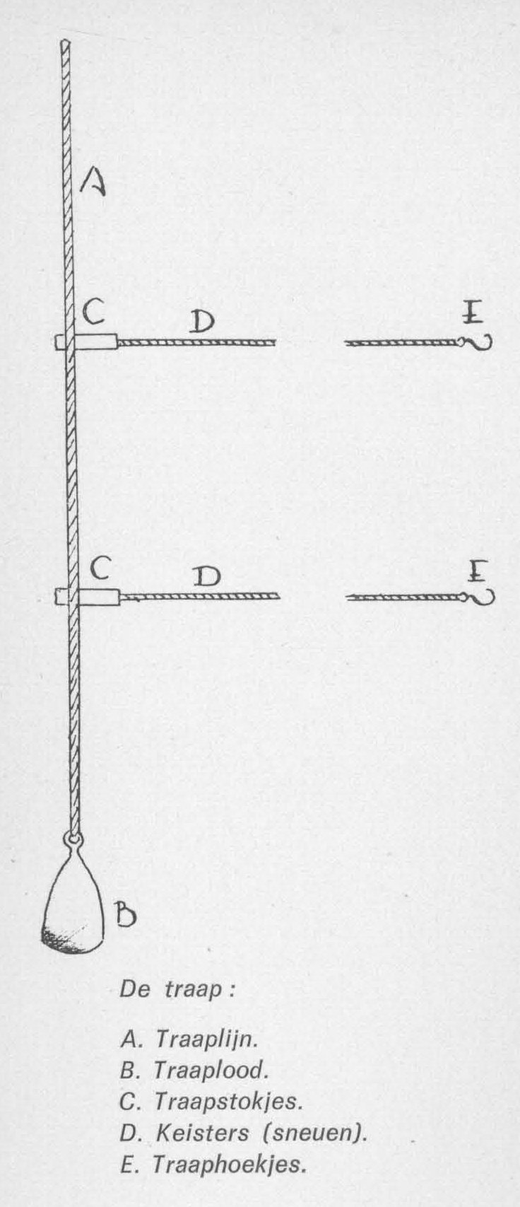 De traap. A. Traaplijn. B. Traaplood. C. Traapstokjes. D. Keisters (sneuen). E. Traaphoekjes.