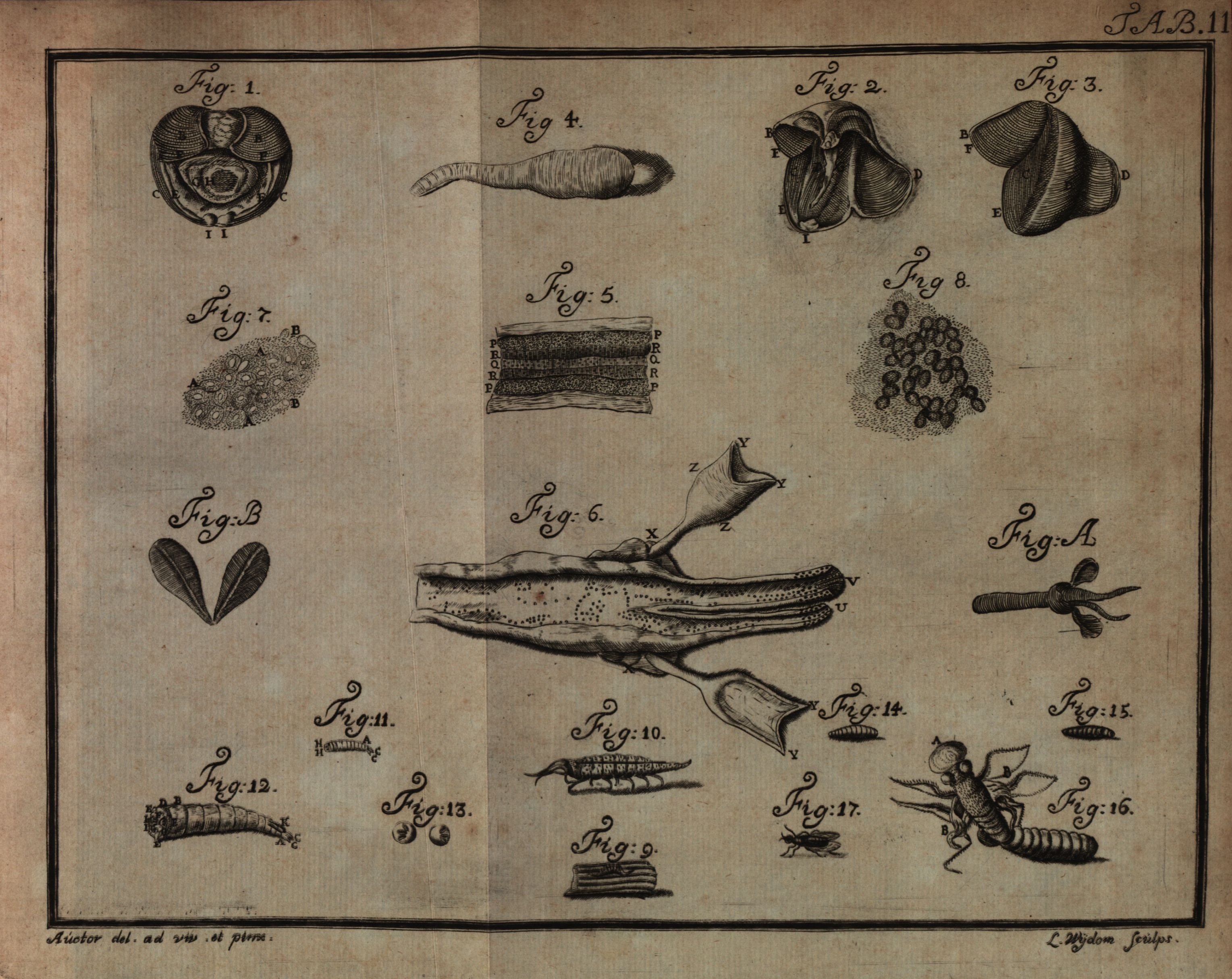 Beschrijving 1 – 8. Teredo marina, een paalworm. 9 – 10. Springertje of snel, later herkend als de boor- of paalpissebed (Limnoria lignorum). 11 – 17. Larve, pop en volwassen exemplaar van een vlieg. A. Achterzijde van een paalworm (Teredo sp. of “Teredinis Navium Vallisnerii”). B. Paletten van een paalworm (Teredo sp. of “Teredinum Oceani”). Deze klepjes sluiten de gangen die het organisme boort af. Auteur G. Sellius Uit bron Sellius, G. (1733). Historia naturalis teredinis seu Xylo... Download de volledige versieDownload de volledige versie