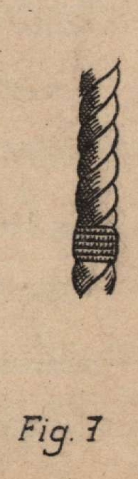 Beschrijving Om de takeling te voltooien, verbruik bijna geheel de bocht garen a voortgaande met gespannen slagen te leggen rond den tros en het deel b van het zeilgaren; trek het einde overschot netjes door met c voor handvat en snijd zoo af, dat geen gareneind meer te zien zij. Auteur J. De Jonghe Uit bron De Jonghe, J. (1912). De sfeer - Het schip - Vaart. Wat z... (pagina 53) Download de volledige versieDownload de volledige versie