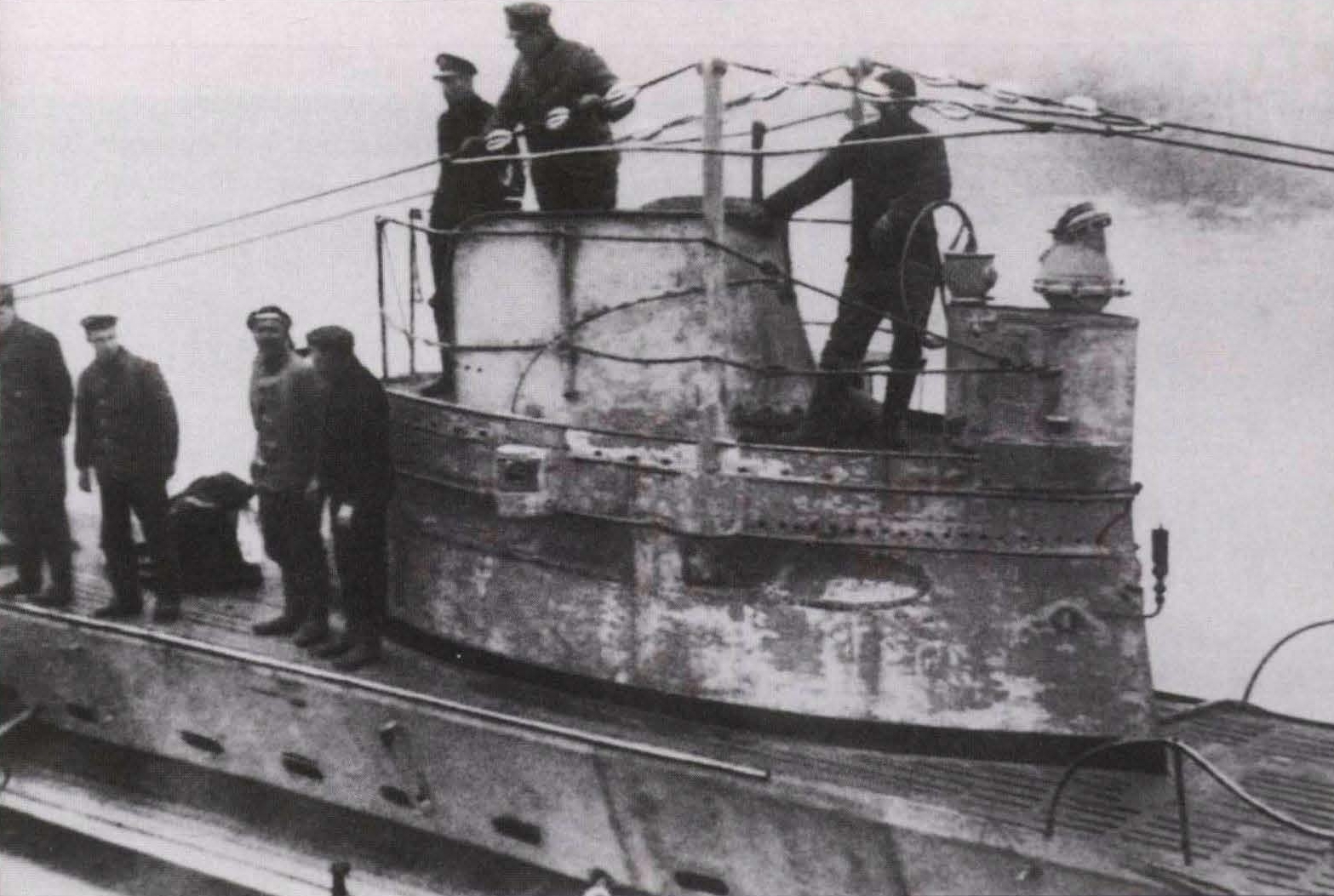 UB38 mit seiner Besatzung beim Anlegemanöver in Zeebrügge, 1916.