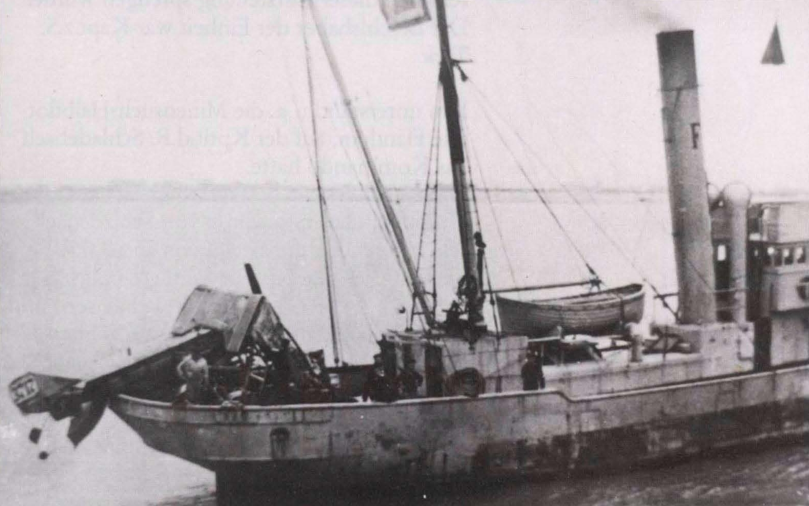Ein Trawler mit einem britischen Flugzeug auf dem Achtersteven in der Nähe des Zeebrügger Hafens.