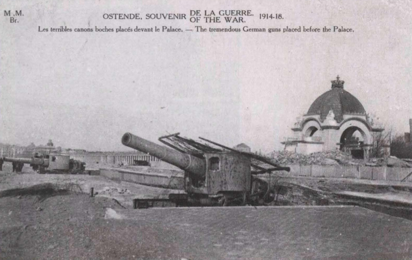 Die Artilleriekanonen der Batterie “Gneisenau II” auf dem Deich vor dem noch existierenden Palace Hotel in Ostende. (Sammlung Johan Ryheul)