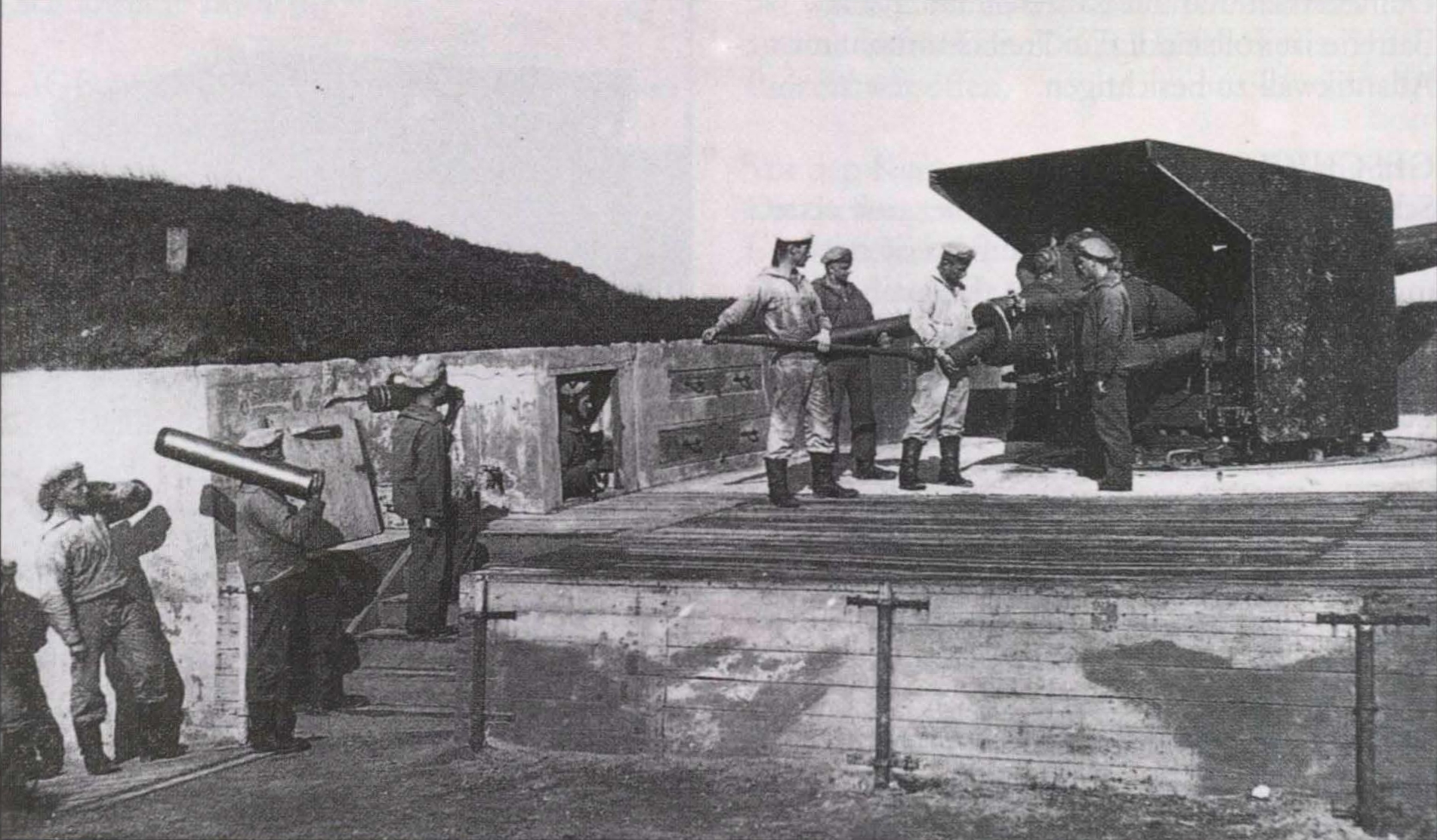 Ein gestelltes Foto, um die Arbeiten der “Cecilie”-Batterie darzustellen. Die Geschosse befanden sich in einem in der Nähe gelegenem Spezialbunker. (Sammlung Johan Ryheul)