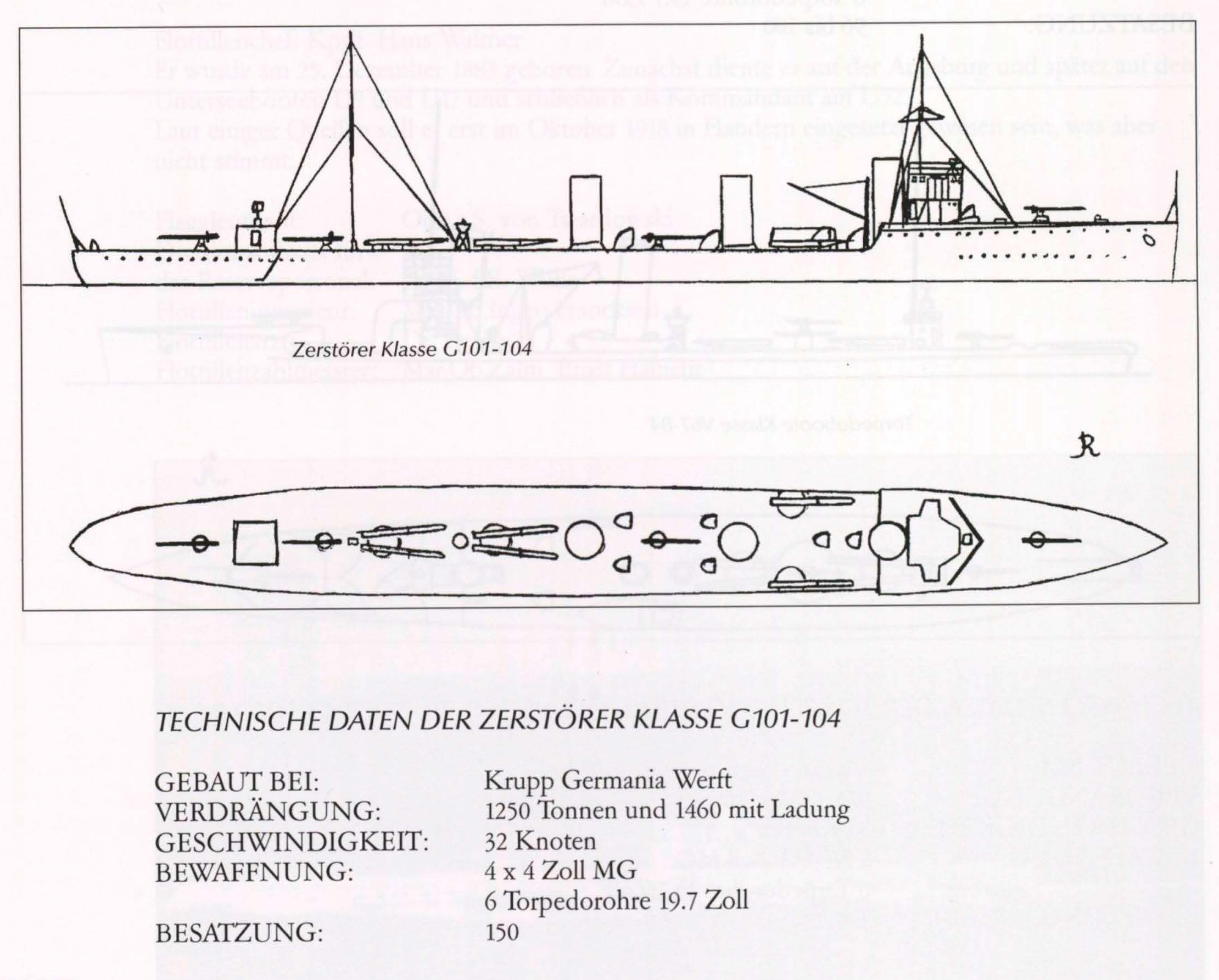 Technische Daten der Zerstörer Klasse G101-104 Gebaut bei: Krupp Germania Werft Verdrängung: 1250 Tonnen und 1460 mit Ladung Geschwindigkeit: 32 Knoten Bewaffnung: 4X4 Zoll MG, 6 Torpedorohre 19.7 Zoll Besatzung: 150