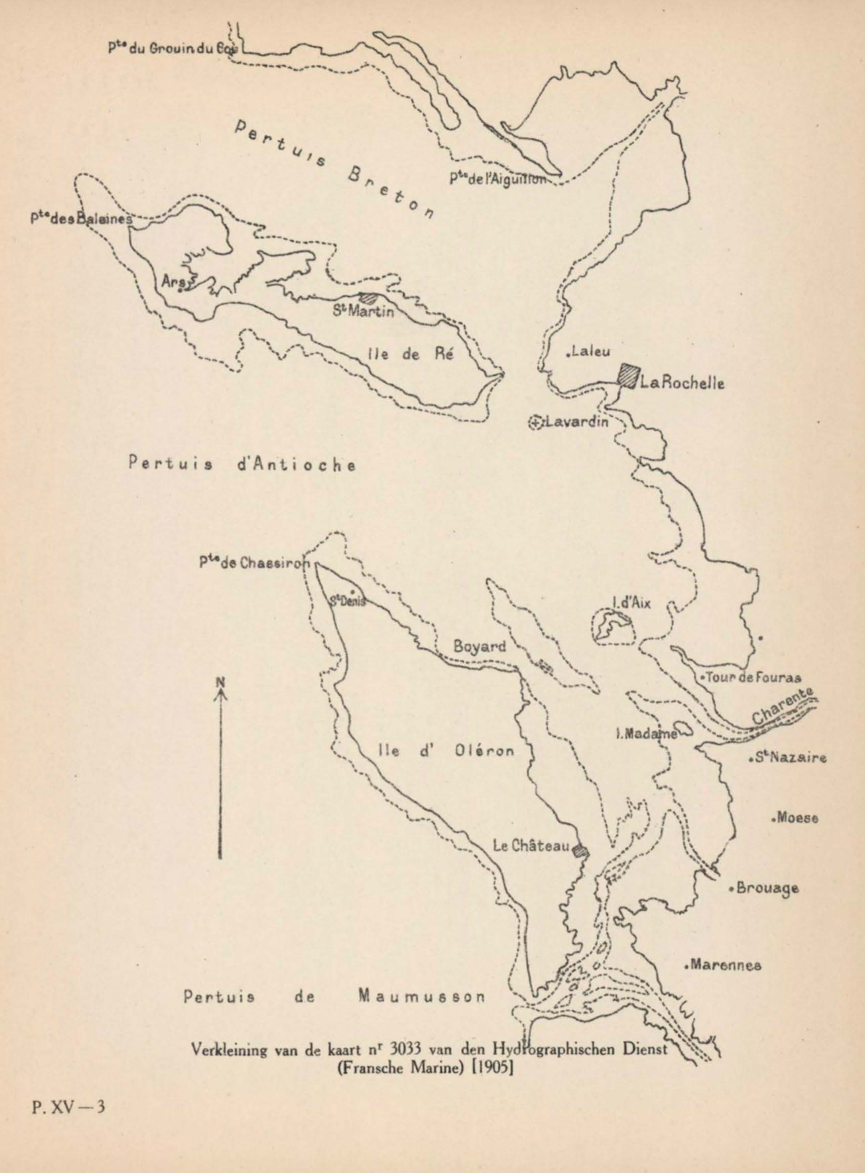 Ruwe kaart van de Fransche kust, van af Pertuis Breton (Kiliaerts) tot Pertuis de Maumusson, met de eilanden Ré (st. martens eylant) en Oléron. Verkleining van de kaart n