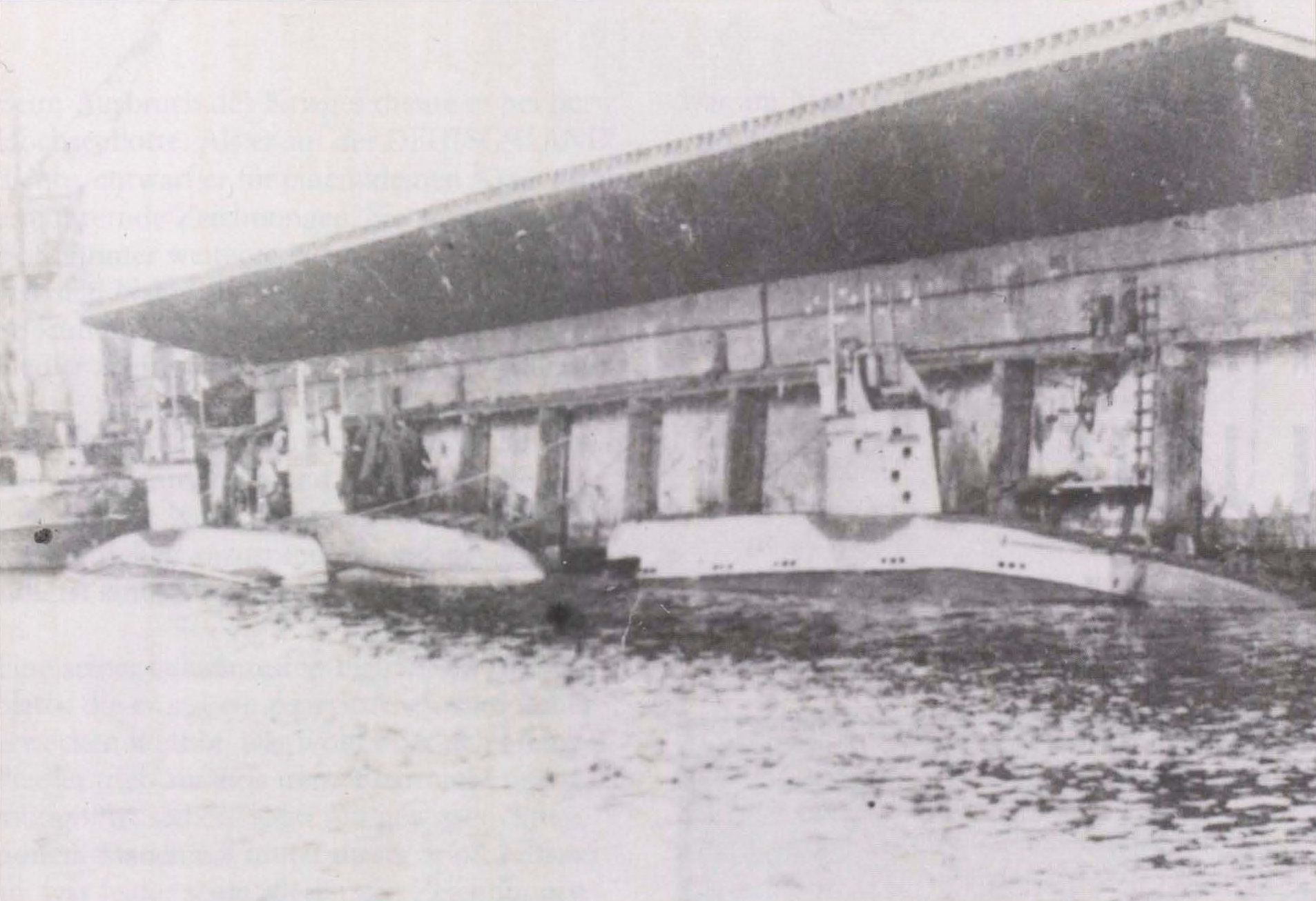 Ein sogenannter Kragunterstand: Ein Schutzdach aus Beton zum Verbergen der U-Boote, am Ostkai des Großen Handelsdocks. UB12 und andere Boote der UB-Klasse im Hinterhafen von Brügge.