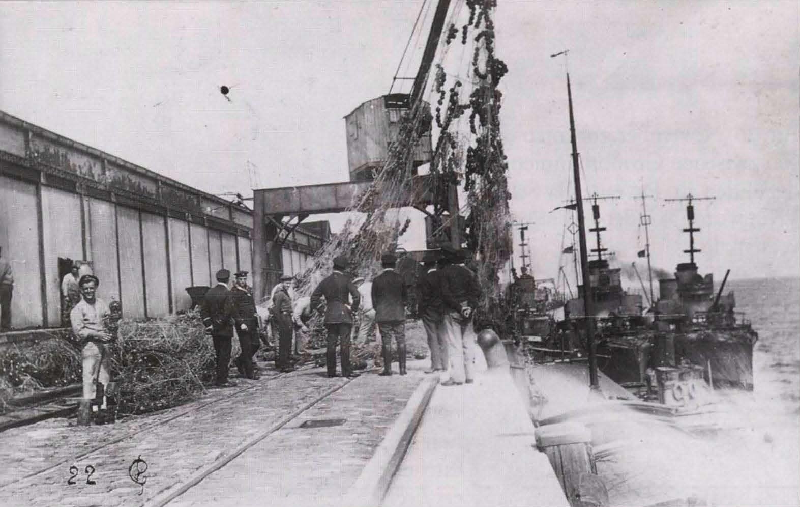 Zerstörer mit Sperrnetzen in Zeebrügge.