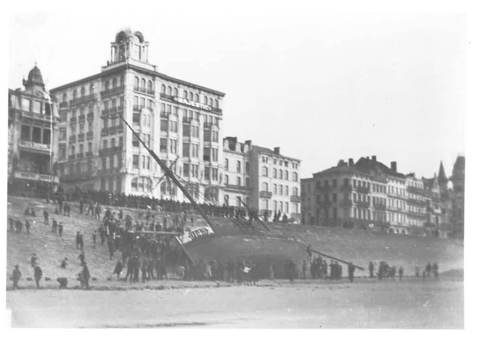 17 mei 1912 : De vissersboot 0. 143 ECHO, gestrand voor de Zeedijk ter hoogte van het Hotel MAJESTIC (hoek Louisaramp)