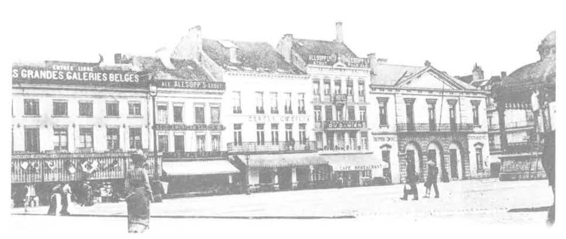 De NOORDKANT van het Wapenplein. Gedeelte tussen de Vlaanderenstraat links en de Louisastraat rechts. Op de hoek van de Louisastraat, de STADSBIBLIOTHEEK (toen de STADSBOEKERIJ genaamd), die in 1940 door bommen werd vernield.