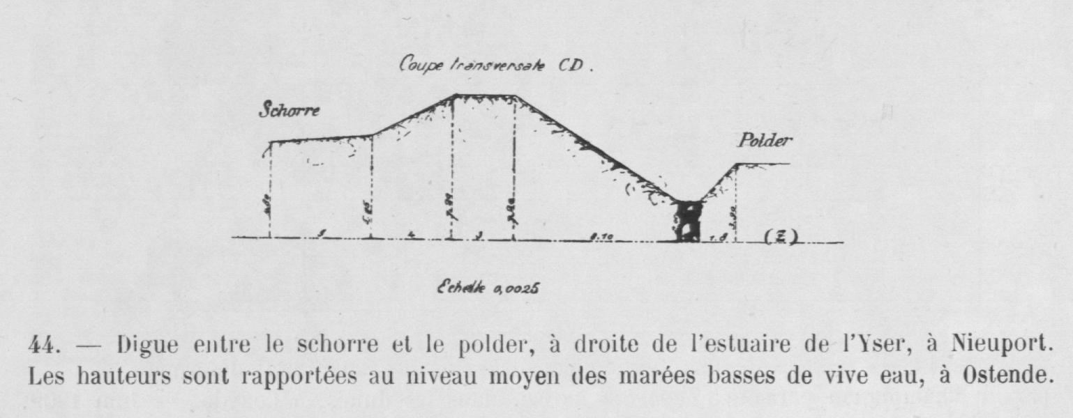 Beschrijving Dijk tussen de schorren en de polders, aan de rechterkant van het IJzerestuarium in Nieuwpoort. De hoogtes zijn weergegeven t.o.v. het gemiddeld waterniveau bij laag water (springtij) te Oostende. Opmerking: de cijfers op de afbeelding zijn niet allemaal meer leesbaar Schaal: 1/400 Auteur Anoniem Uit bron Massart, J. (1913). La cinquantième herborisation général... Download de volledige versieDownload de volledige versie