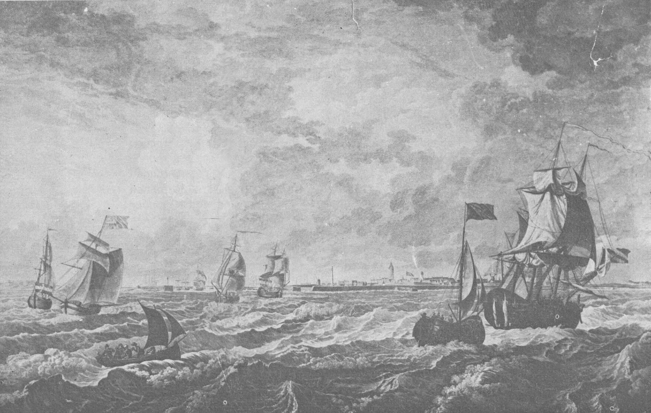 Kopergravure van zicht op Oostende in 1782. Links een Engels vissersvaartuig, centraal een vishoeker en een handelshoeker. Naast de handelshoeker rechts een achttiende-eeuwse Oostende sloep.